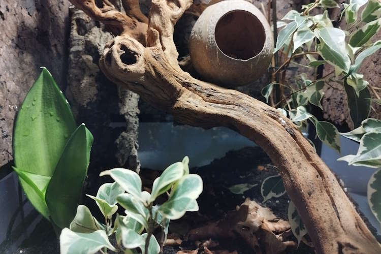 Les cachettes sont indispensables : troncs de chêne-liège creux, noix de coco ouvertes et plantes fournies (naturelles ou artificielles) sont très appréciés. Les éléments doivent être stables ou solidement fixés pour éviter les accidents. Attention également à éviter tout objet pointu, coupant ou abrasif dans le terrarium.